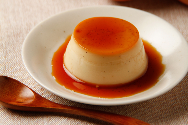 - カラメルを作る。鍋にグラニュー糖と水を入れ、弱火で熱する。飴色になったら火をとめ、熱湯を入れて軽くゆする。再度弱火で熱し、全体をなじませる。30秒ほど経ったら火を止め、容器へ等分に流し入れる。